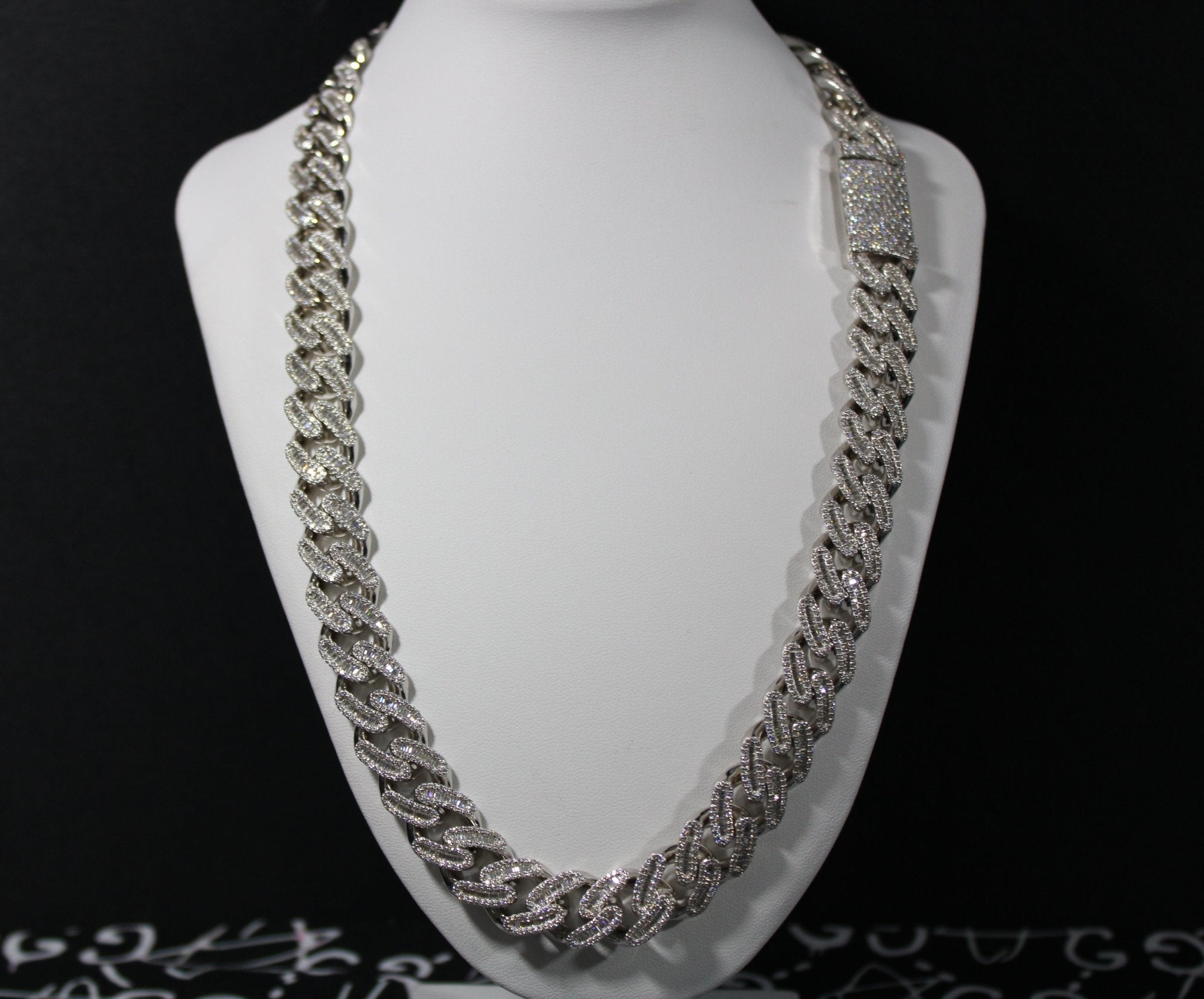 This 14MM Baguette Moissanite Cuban takes the evergreen Miami link and floods it with two channel-set rows of baguette moissanite inside every link, tapering stone sizes for a seamless, fully iced face. Result: almost zero metal showing and a flat-laying profile that reads luxury from every angle.