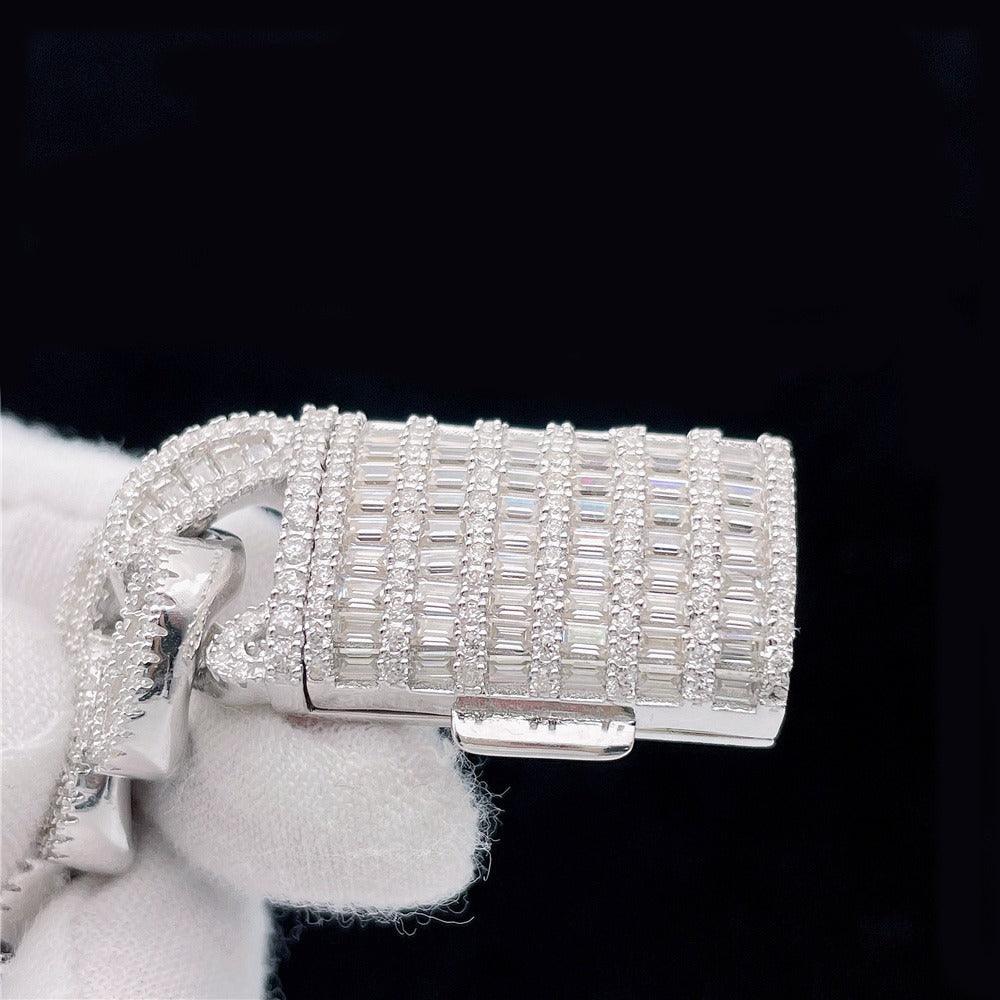 This 15mm Baguette Moissanite Cuban is a fully evolved take on the classic Miami link—engineered so almost no metal shows and every angle hits like a wall of light. Each link blends invisible-set baguettes (glassy flash) with prong-set rounds (full-spectrum fire), with tapered stone sizing for a flawless, high-jewelry aesthetic.