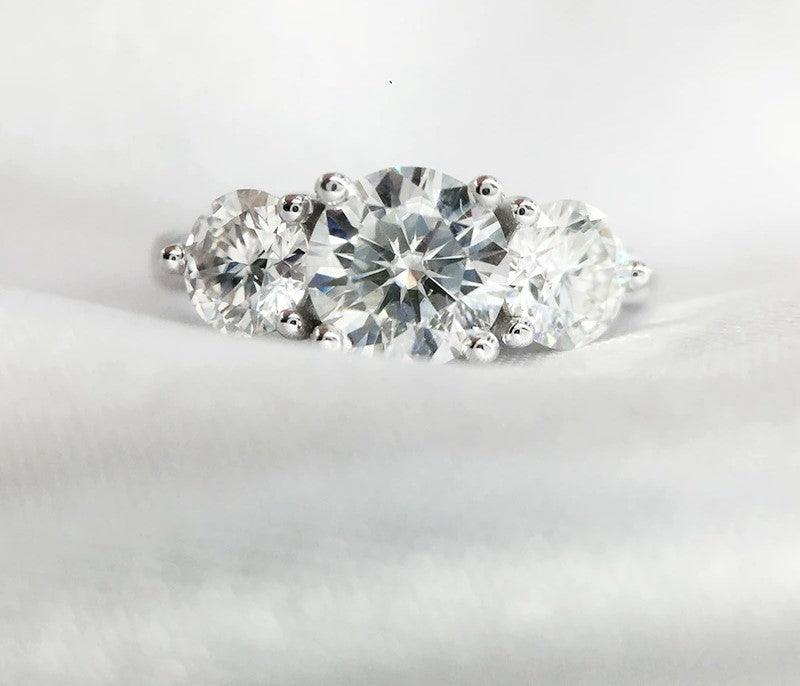 Features a 2-carat round brilliant moissanite center stone, flanked by two 1-carat side stones, for a total of 3 carats of unmissable brilliance and emotional power.