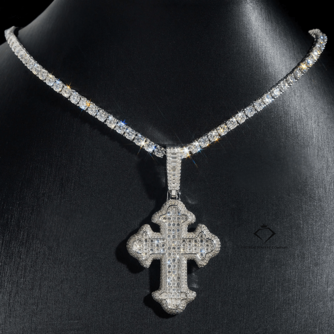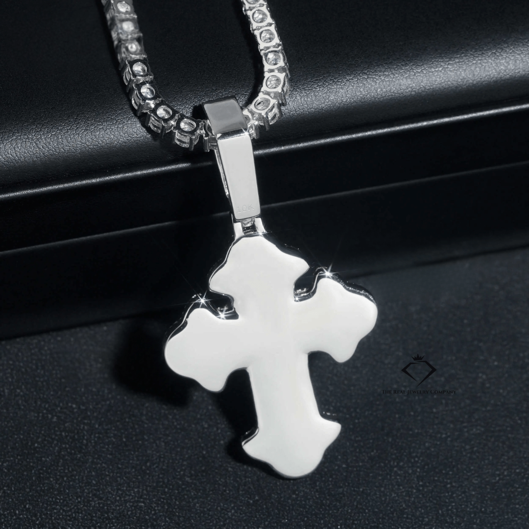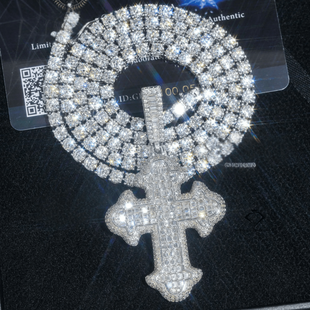 Crafted for bold expression and unmatched shine, the Custom Iced Cross Pendant blends spiritual edge with street-certified ice. Handcrafted from solid 925 sterling silver, this piece is flooded with D-color VVS Moissanite stones that pass the diamond tester—all wrapped in your choice of Rhodium, Yellow Gold or Rose Gold plating.